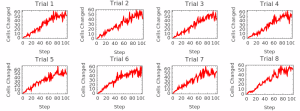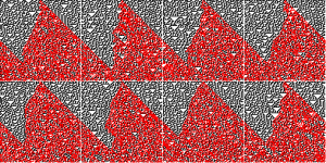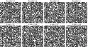This shows 8 different completely random initial conditions (50% density) to reveal variability in outcomes: