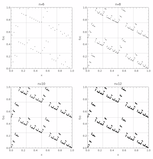 Reversibility and Bijection: Reversible CA rules produce bijective (one-to-one and onto) functions on the Cantor set. In the plot, this appears as a graph where each horizontal line intersects exactly once - every output has exactly one input. The graph of a reversible rule has special symmetry properties and preserves measure, making it a measure-preserving transformation of fundamental importance in ergodic theory.