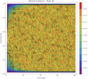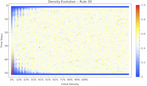 Critical Phenomena Detection: Sharp transitions in the density evolution heatmap often indicate critical phenomena and phase boundaries. These appear as sudden changes in behavior at specific initial densities, revealing critical thresholds where the rule's qualitative behavior changes dramatically.