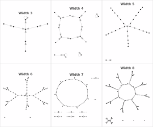 Cycle Lengths and Periods: The perimeter of each polygon gives the cycle length. Count the nodes in a loop to determine the period. The longest cycle in the graph is the maximum repetition period for that system size. Comparing maximum cycle lengths across different widths reveals how the rule's temporal complexity scales with spatial size.