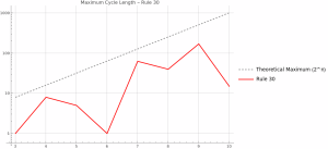 Theoretical Maximum and Complexity Bounds: In a system with n cells, there are exactly 2^n possible configurations, providing an absolute upper bound on cycle length. Rules approaching this maximum exhibit highly complex, pseudo-chaotic behavior where the system takes exponentially long to repeat. The ratio of actual maximum cycle to theoretical maximum quantifies the rule's effective state space utilization.